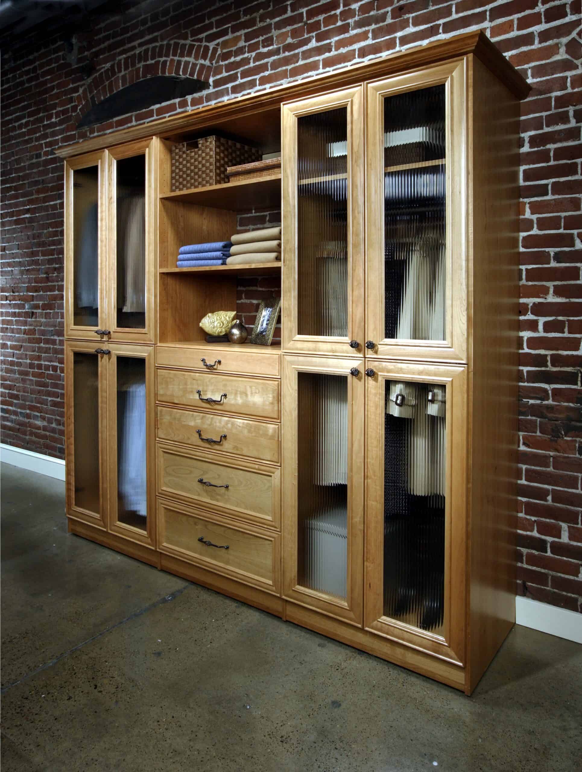 This wardrobe adds storage where needed and provides a more elegant look than a standard pre-built closet. Well-placed drawers conceal storage, and glass cabinet doors make it easy to see what’s inside.